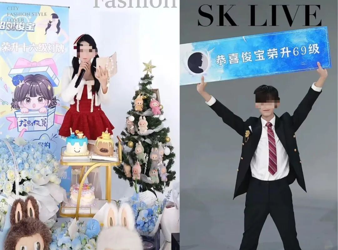 这类升级仪式通常会额外布置场景,以“大哥大姐”专属颜色为主色调,并搭配各类庆典道具,氛围感拉满。
