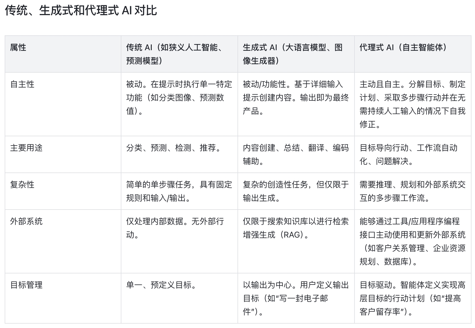 生成式 AI 的核心,是根据提示直接生成输出;而代理式 AI 是一套自主系统,能独立规划、执行多步骤任务,最终达成高层目标。两者的核心差异,一文看懂。对想要落地AI技术的企业来说,搞懂不同类型AI之间的区别,至关重要。代理式 AI 的出现,标志着AI从纯粹的预测性、创造性,向真正自主、目标导向的智能跨越。