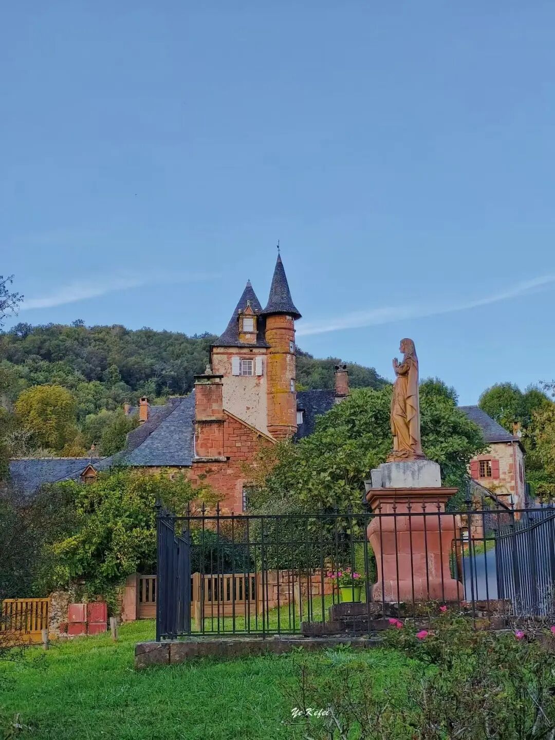 科隆日拉鲁日与无数法国小城镇一样,被无尽的绿所围绕。驶入城镇边缘,眼前立刻出现一片红色,在山谷中被绿意环抱。这座城镇的建制史可以追溯到公元8世纪,当时它位于通往德孔波斯特拉的朝圣路线上,又临近另一个朝圣地罗卡马杜尔,因此修建了供朝圣者休憩的修道院,城镇迅速围绕修道院而发展。