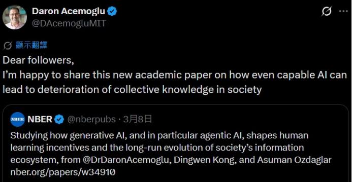 菲利普·阿吉翁虽然靠“创新与经济增长”的课题拿了诺奖,但当下基本没有对AI表态过。他的社交媒体账号明说了是学生们在打理,日常发布内容也是同行教职任免动态和新书广告。