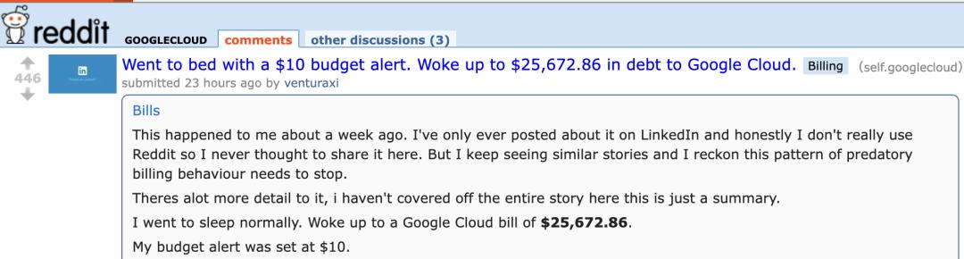 “睡前设 10 美元预算预警,结果一觉醒来收到 Google Cloud 的天价欠费账单。”