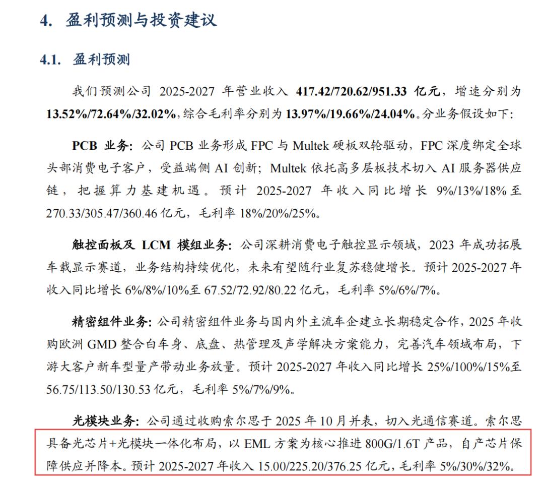 以国盛证券测算为例,东山精密光模块业务收入将从2025年的14.5亿元增长至2027年的300亿元以上,增幅超过20倍。
