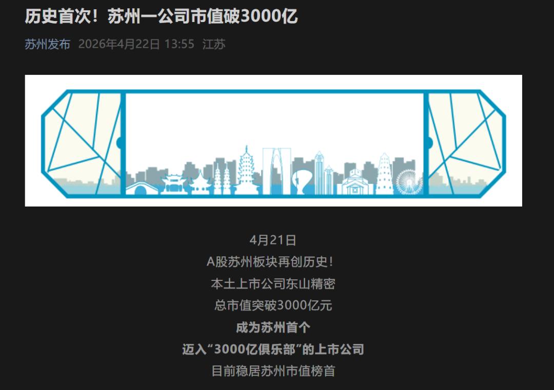 凭借这波凌厉上涨,东山精密也顺势成为苏州首家市值站上3000亿元的上市公司。