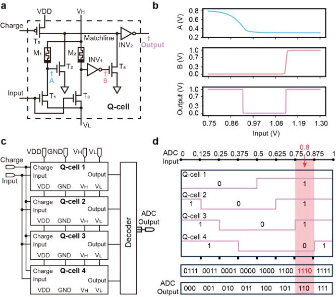 (a) 论文提出的基于忆阻器(M1, M2)的Q-cell核心电路;(c, d) 多个Q-cell和一个解码器(Decoder)共同构成一个完整的ADC。