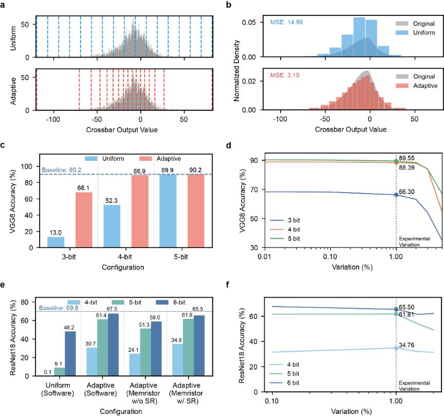 结果令人振奋:在使用该策略后,ResNet18的推理准确率不仅完全恢复(图6e中第四组相比于第二组数据),甚至在4-bit等配置下反超了没有器件差异的理想软件基准! 这一「变Bug为Feature」的思路,为解决模拟计算的硬件缺陷提供了全新的视角。