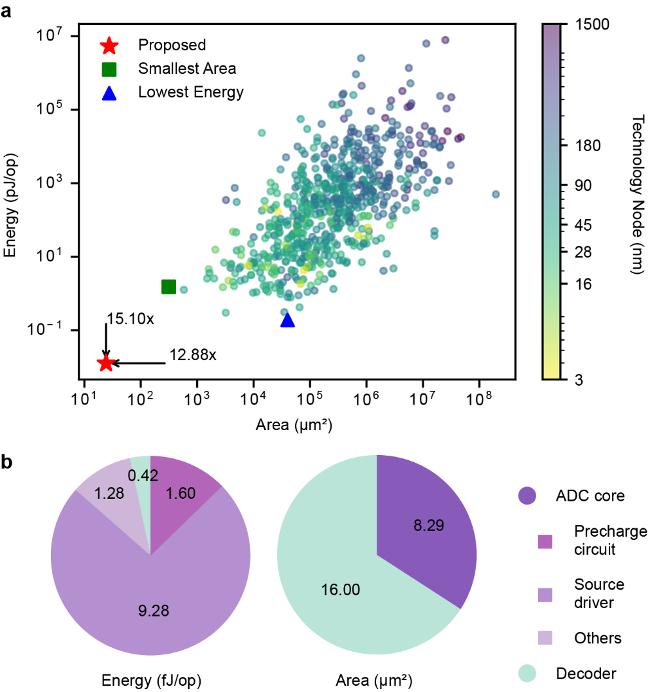(a) 忆阻器ADC(红星)与SOTA ADC在能效-面积图上的对比,(b) 忆阻器ADC的能耗与面积构成分析。