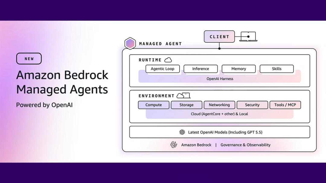 在此基础上,双方联合推出了 Bedrock Managed Agents 预览版。这套服务以 OpenAI Agent Harness 为核心构建,Harness 就像是一本专门为模型定制的战术手册。经过协同训练后,Agent 可以在长时间运行的复杂任务中实现更快的执行速度和更稳定的行为控制。