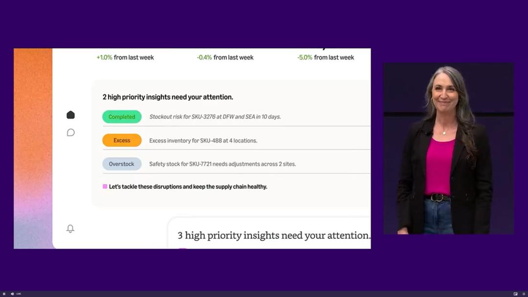当监控到关键供应商交货落后(例如预计 10 天内导致两个配送中心断货)时,它会将传统软件每天产生的数千条警报收敛为几条最高优先级的例外事项,并直接给出两套附带预期影响、成本和置信度评分的处置方案。规划师手动选择并说明原因后,系统会吸收这条判断逻辑,供未来参考。