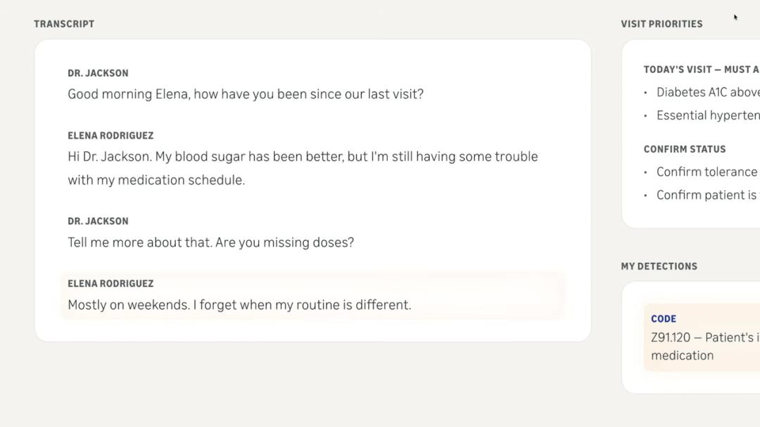 亚马逊应用人工智能解决方案高级副总裁 Colleen Aubrey 指出,大量精力消耗在管理事务而非直接诊疗上,是亟待解决的痛点。Connect Health 可以在诊疗过程中自动记录临床内容、生成就诊摘要和推荐账单编码,并能在就诊后发送患者易于理解的随访说明。