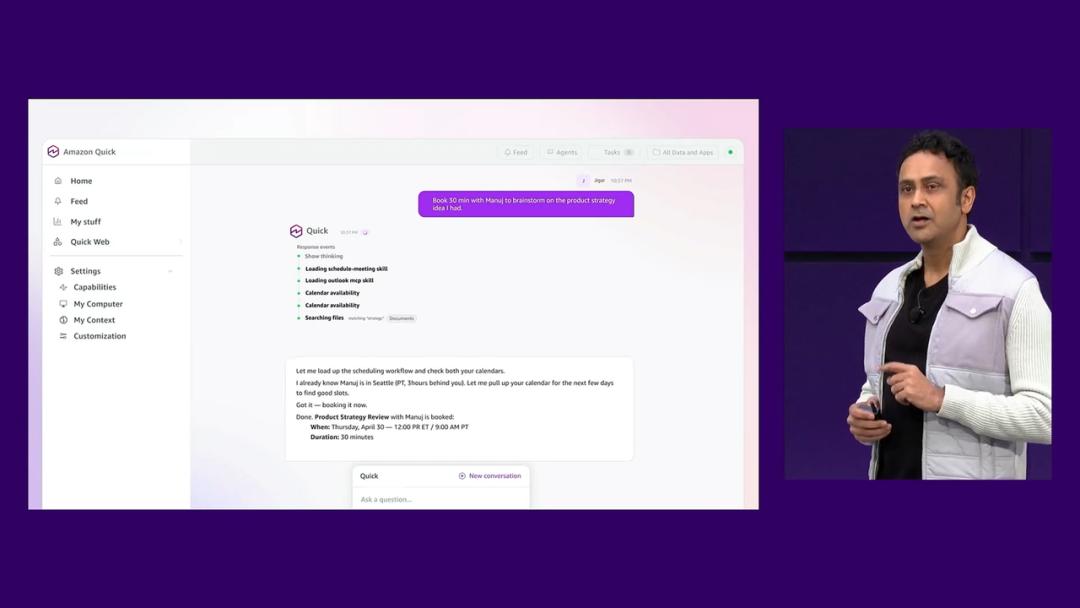 Amazon Quick 会迅速认出「王总」是哪个项目的,然后去系统里把王总团队之前的历史案例扒出来,接着去你的本地 D 盘里偷窥……哦不,读取最新的产品路线图,再结合 Slack 里同事昨天的吐槽记录。几分钟后,一份逻辑严密、排版精美的 PPT 就糊在了你脸上。