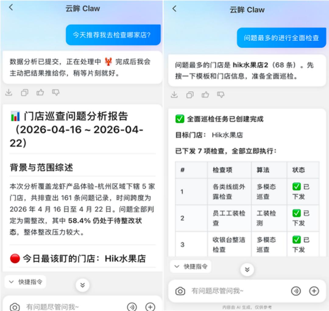 这正是海康威视近期发布的云眸Claw所选择的方向。基于多年零售连锁门店管理的积累经验,它没有试图用一个“万能助手”去覆盖所有场景,而是把龙虾整合多模块能力嵌入巡店这一条最核心、最复杂的管理链路中,让系统不仅能理解任务,还能承接执行、闭环和柔性调整。