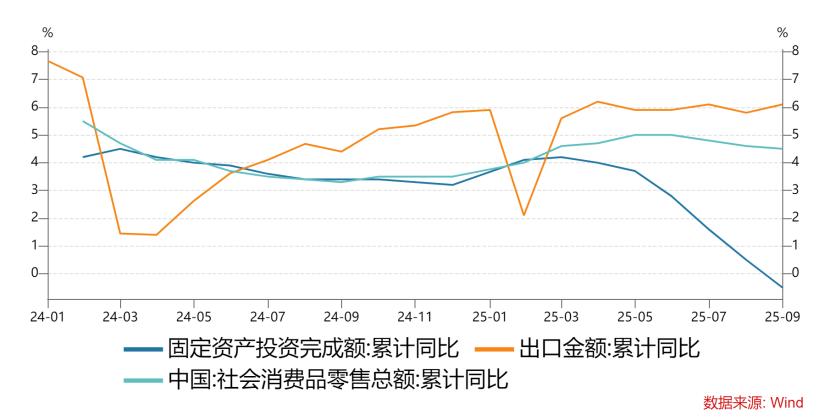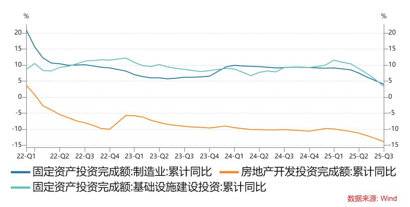 前三季度制造业投资增速4.0%,从7月中央提出“反内卷”政策信号后,制造业投资增速开始明显下降,说明无效、超额投资增速被遏制。前三季度基建投资增速3.3%,比去年增速下滑近6个百分点,主要因为今年专项债增量中相当一部分用于置换隐债、收购存量商品房、用于 “两重” 项目,形成实物工作量的节奏偏慢;且地产下行周期,土地财政持续萎缩,配套基建需求锐减,以上因素导致基建投资增速放缓。