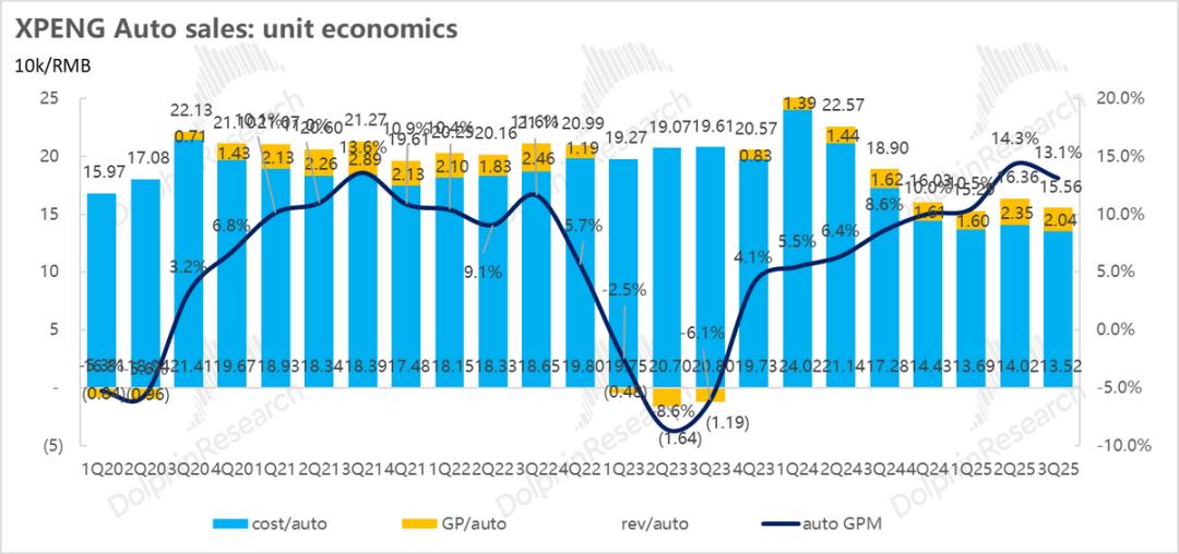 但三季度小鹏的实际卖车毛利率13.1%,环比上季度14.3%还要继续下行1.2个百分点,同样也要低于市场预期,主要由于本季度卖车单价的环比下滑导致。