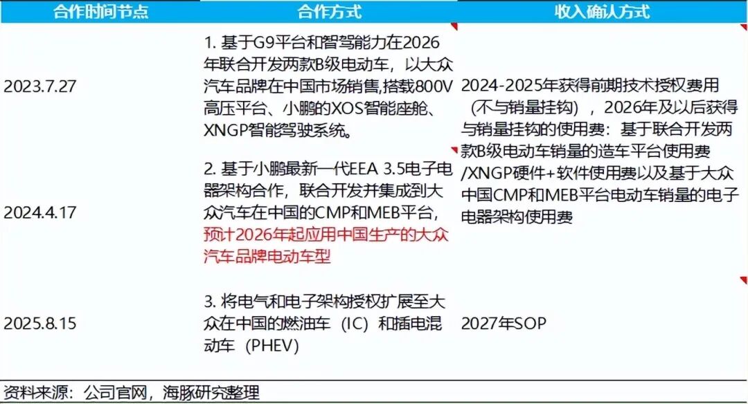 三季度,小鹏与大众合作范围继续扩大,将基于小鹏的电子电气架构授权继续扩大至大众在中国生产的燃油车和插混车(原大众的纯电动车),而大众的主力车型在燃油车和插混车上,预计2027年开始生产及确认与销量直接挂钩的授权服务费。