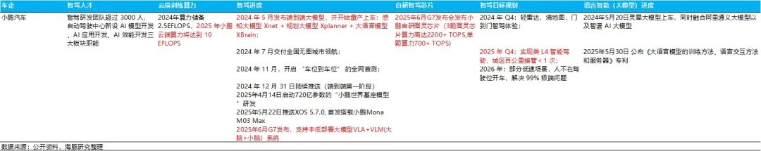 硬件层面:自研高阶 “图灵芯片” 已量产,单颗算力 750 TOPS,新 P7 搭载 3 颗(总算力 2250 TOPS),已应用于 G7、新 P7 等车型,算力储备仍然领先。