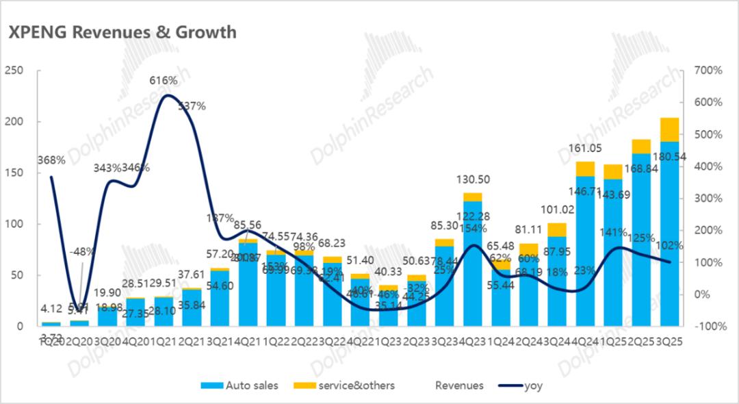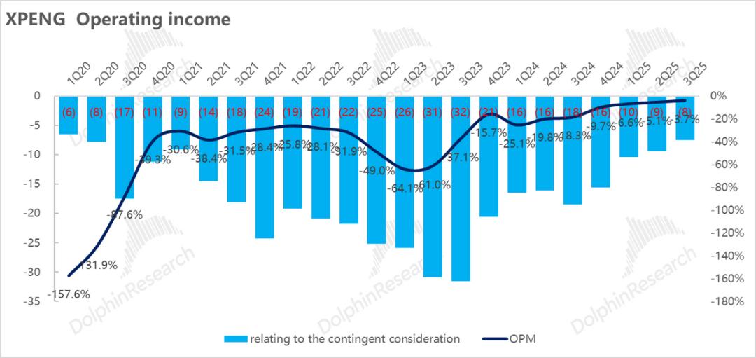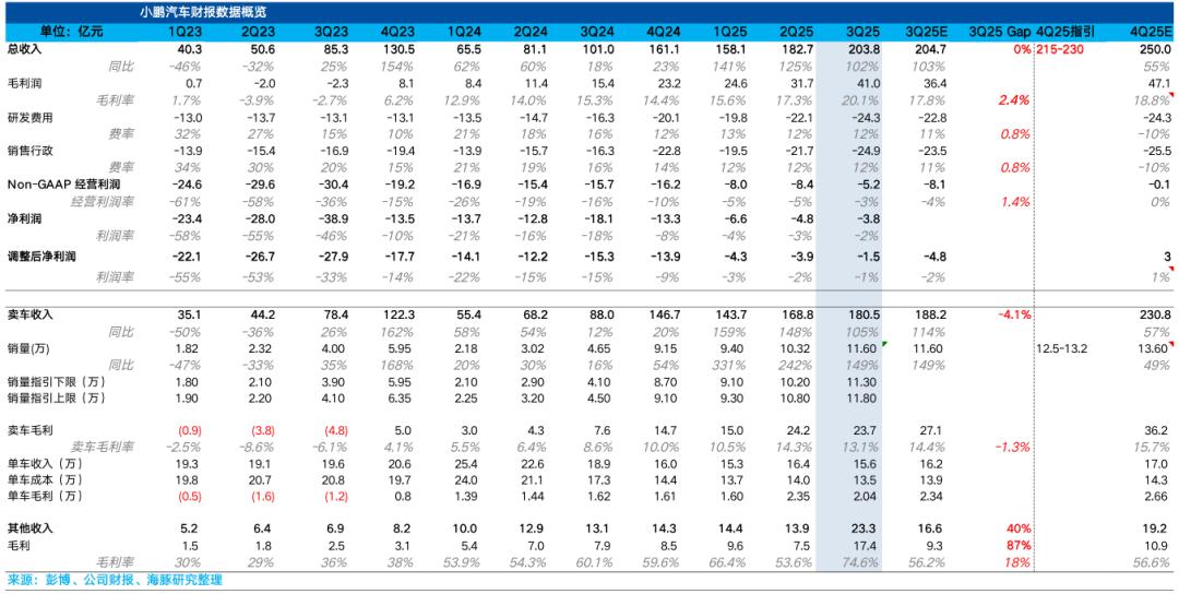 三季度小鹏实现总收入203.8亿,低于市场预期204.7亿,主要因为卖车收入低于预期,而服务及其他业务收入23.3亿,高于市场预期16.6亿。