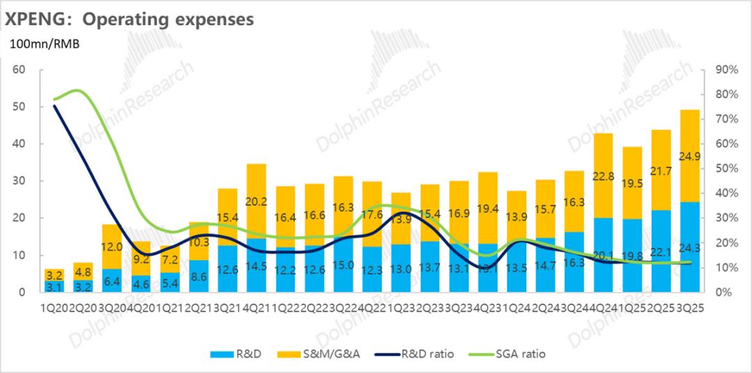 从这个季度的情况来看,小鹏的研发费用达到24.3亿,大幅高于市场预期22.8亿, 环比上季度22.1亿继续上行2.2亿元。
