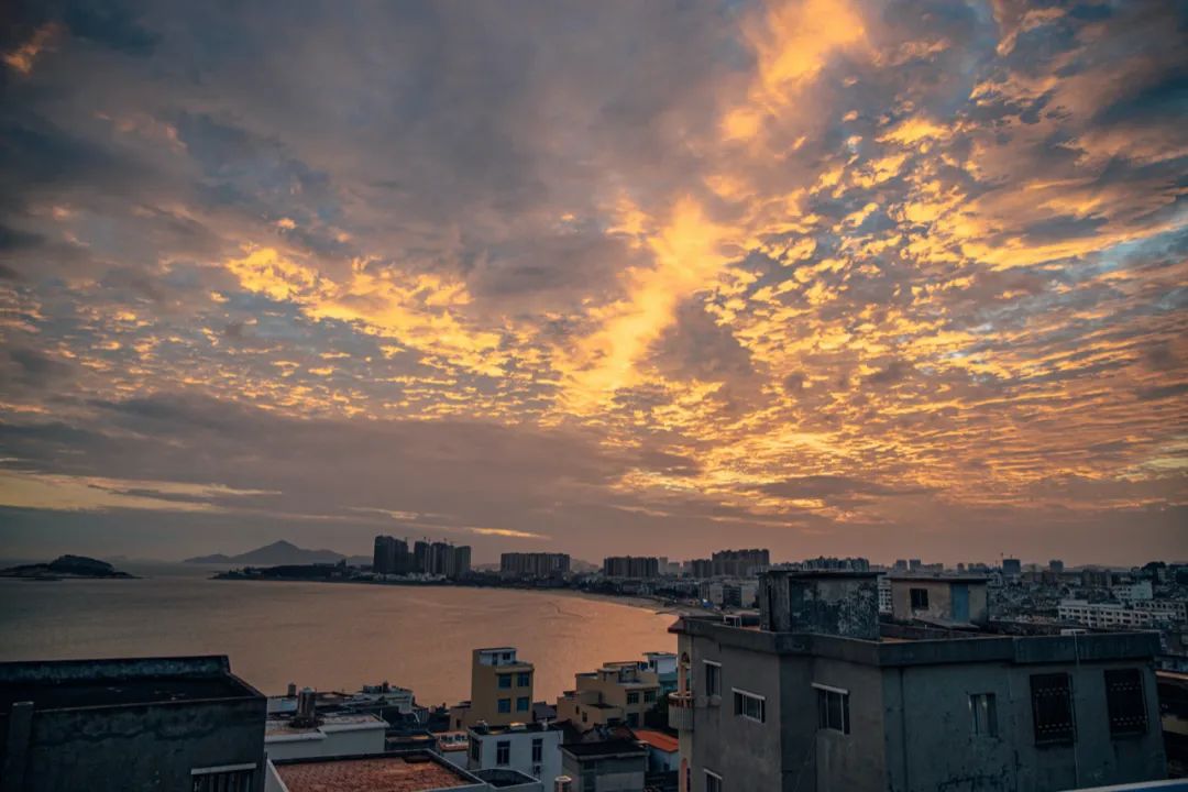 太阳将云层撕裂,金黄的光芒在水面被无限拉长,与天空连成一线。这是属于南门湾的第一缕阳光。