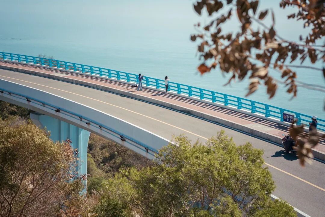 也许是淡季,车辆很少,这条环岛路穿越山头,护栏被天蓝色的颜料粉刷,一侧是清澈见底的大海,一侧是翠绿的山峦。