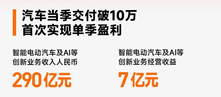 其中,小米集团2025年第三季度智能电动汽车收入283亿元,其他相关收入7亿元,并且本季度小米汽车及AI等创新业务分部首次实现单季度经营收益转正,实现单季经营收益7亿元。