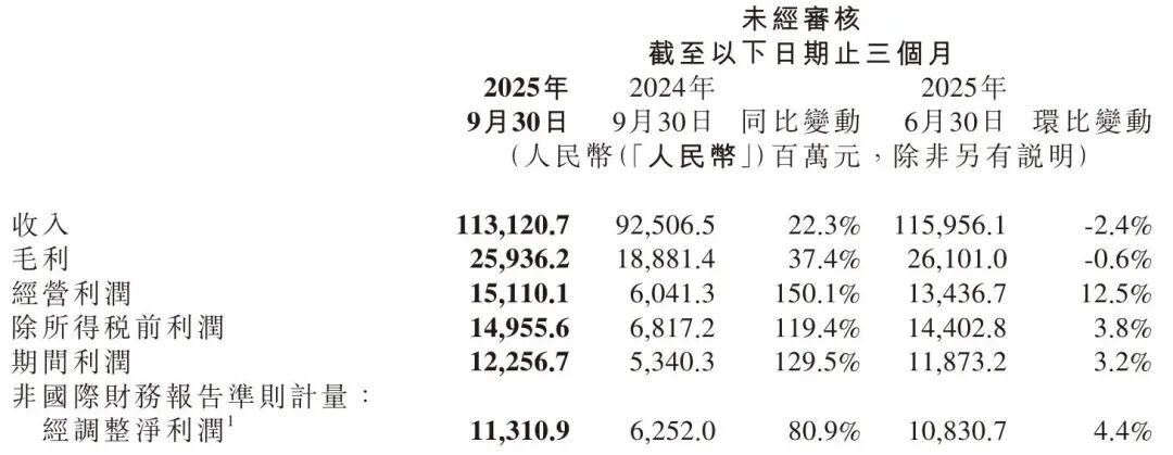 小米集团2025年第三季度经调整净利为113.11亿元,较上年同期的62.52亿元增长80.9%,较上一季度的108.31亿元增长4.4%。
