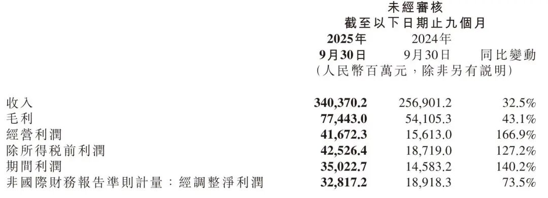 小米集团2025年前9个月期内利润为350亿元,较上年同期的145.83亿元增长140.2%;经调整净利为328.17亿元,较上年同期的189.18亿元增长73.5%。
