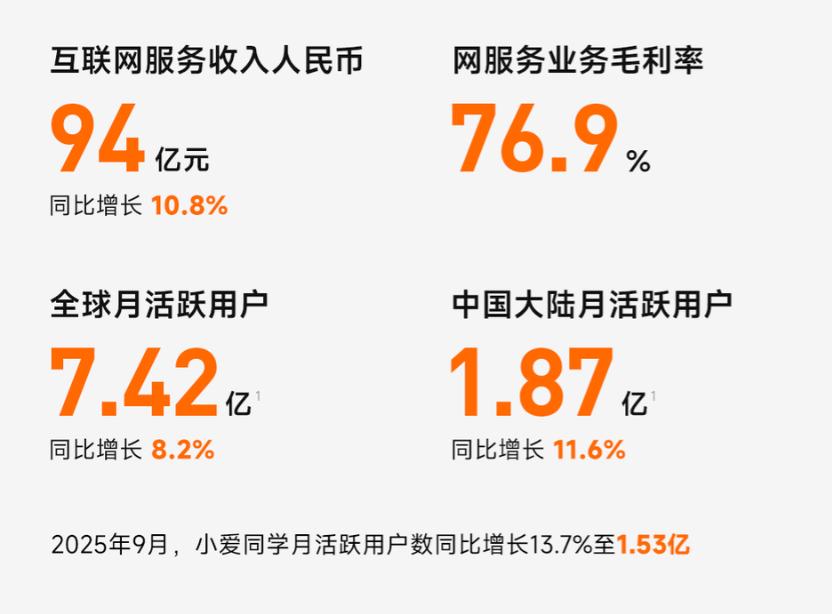 拥有五件及以上连接至小米AIoT平台的设备(不包括智能手机、平板及笔记本电脑)用户数达到2160万,同比增长26.1%。2025年9月,米家APP的月活跃用户数1.146亿,同比增长14.4%;小爱同学的月活跃用户数1.534亿,同比增长13.7%。