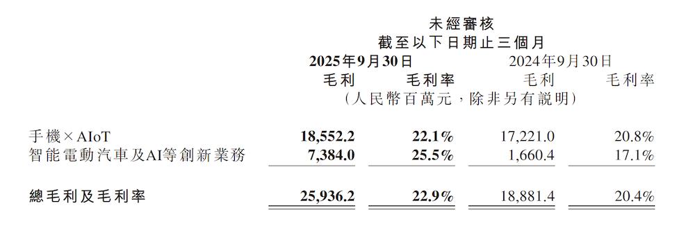 毛利率方面,小米汽车及AI创新业务三季度毛利率为25.5%,较去年同期的17.1%的毛利率实现大幅增长,并且这一毛利率水平已超过不少头部车企。