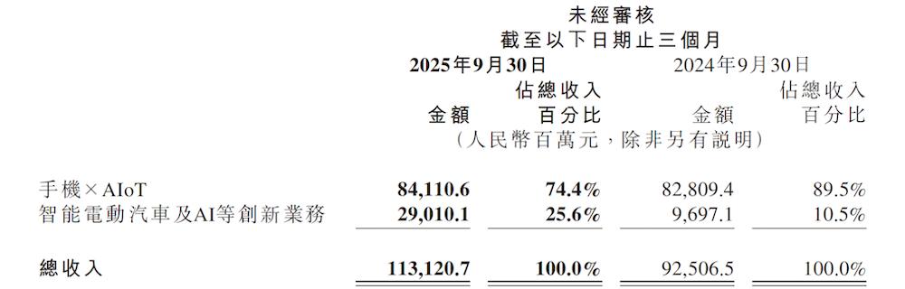 从财务数据表现来看,小米汽车智能电动汽车及AI等创新业务分部在2025年第三季度表现不错,智能电动汽车收入达283亿元,占智能电动汽车及AI等创新业务总收入的98%,较第二季度的206亿元增长77亿元,环比增幅达37%,这主要是由于汽车交付量及ASP均有所增加所致。