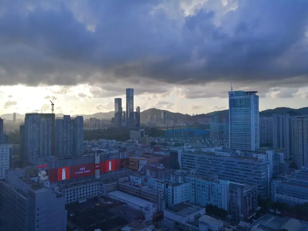 爬上步行街的观景台向南回望:暮色渐起,茂业天地和曼哈商业广场的电子大屏跳脱着绚丽的美妆广告,人们变得很小,沿街商户贴着墙面来回忙碌,下班和赶来夜生活的人群在广场上穿梭,大叔大妈们坐在台子上歇脚,小孩子在一旁奔跑;脚下,是同样热闹的地铁商业街;远处,北面银湖山与南面的香港鸡公岭遥相呼应,青山的背脊勾勒出夕阳余晖下最后一抹剪影。