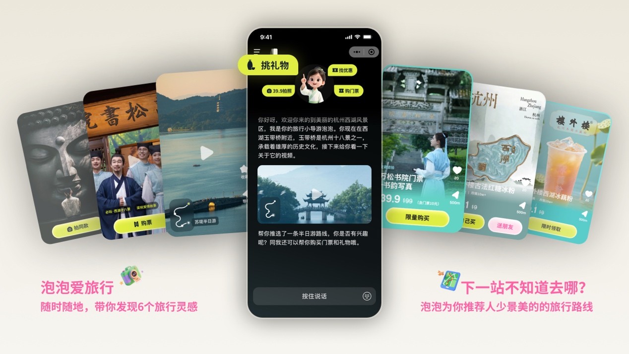 在“门票+”场景中,比利选择了与 OTA 、OTT完全不同的切入点,即行中消费场景,并推出西湖国家风景区首个智能体应用泡泡爱旅行。