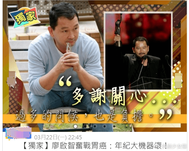 据港媒报道,廖启智近期爆发胃癌,入院后需要彻底停药治疗。