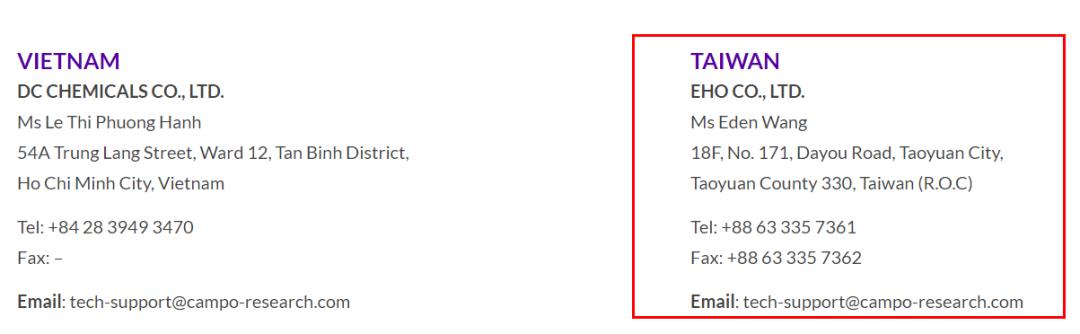 值得注意的是,Campo Cosmetics官网显示,其在中国台湾的经销商为EHO CO., LTD.,正是食药署文件中公布的亦鸿企业。