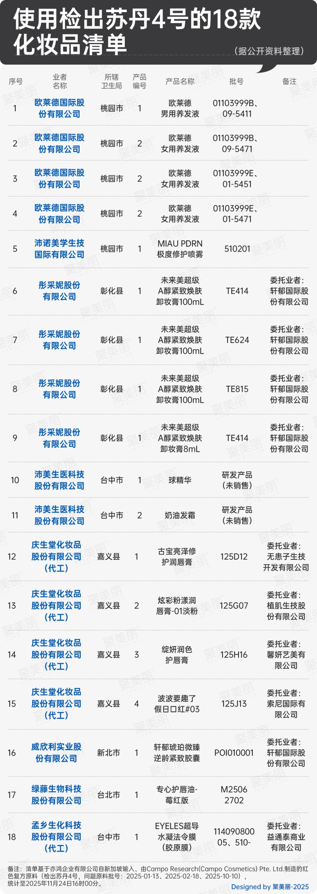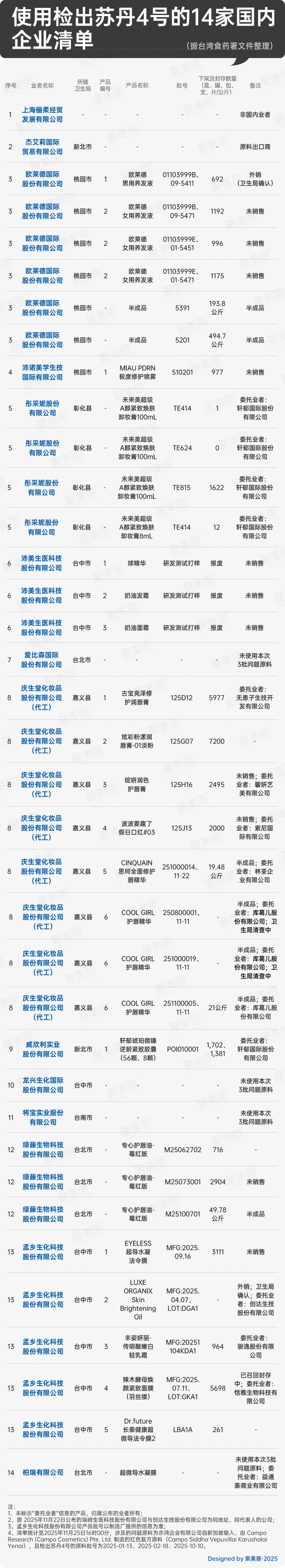 而在11月24-25日发布的两则公告中,公开了下游使用问题原料的14家企业与18款产品清单,并要求未确认安全前相关产品禁止上架。