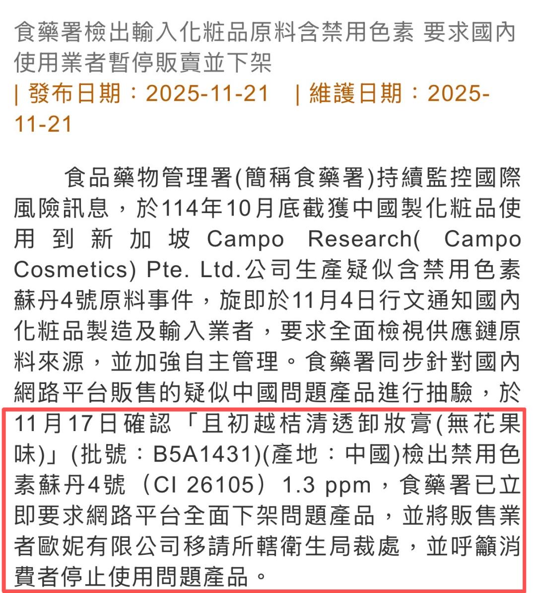 11月21日,台湾食药署发布一则关于《检出输入化妆品原料含禁用色素 要求国内使用业者暂停贩卖并下架》的公告,其中指出已在11月17日坐实且初越桔清透卸妆膏(无花果味)(批号:B5A1431,产地:中国),检出1.3ppm禁用色素苏丹红Ⅳ。