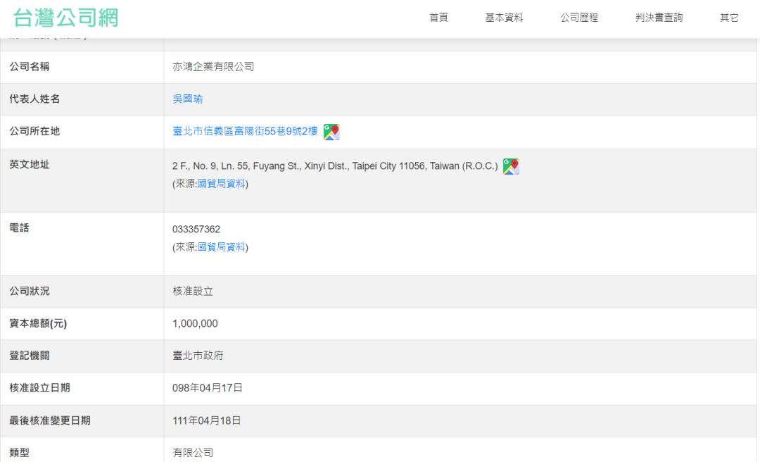 据台湾公司网显示,亦鸿企业成立于2009 年4 月17日,资本总额为100万新台币(约合人民币23万元),其于2022年4月将董事及负责人,由王湘玲变更为吴国瑜。