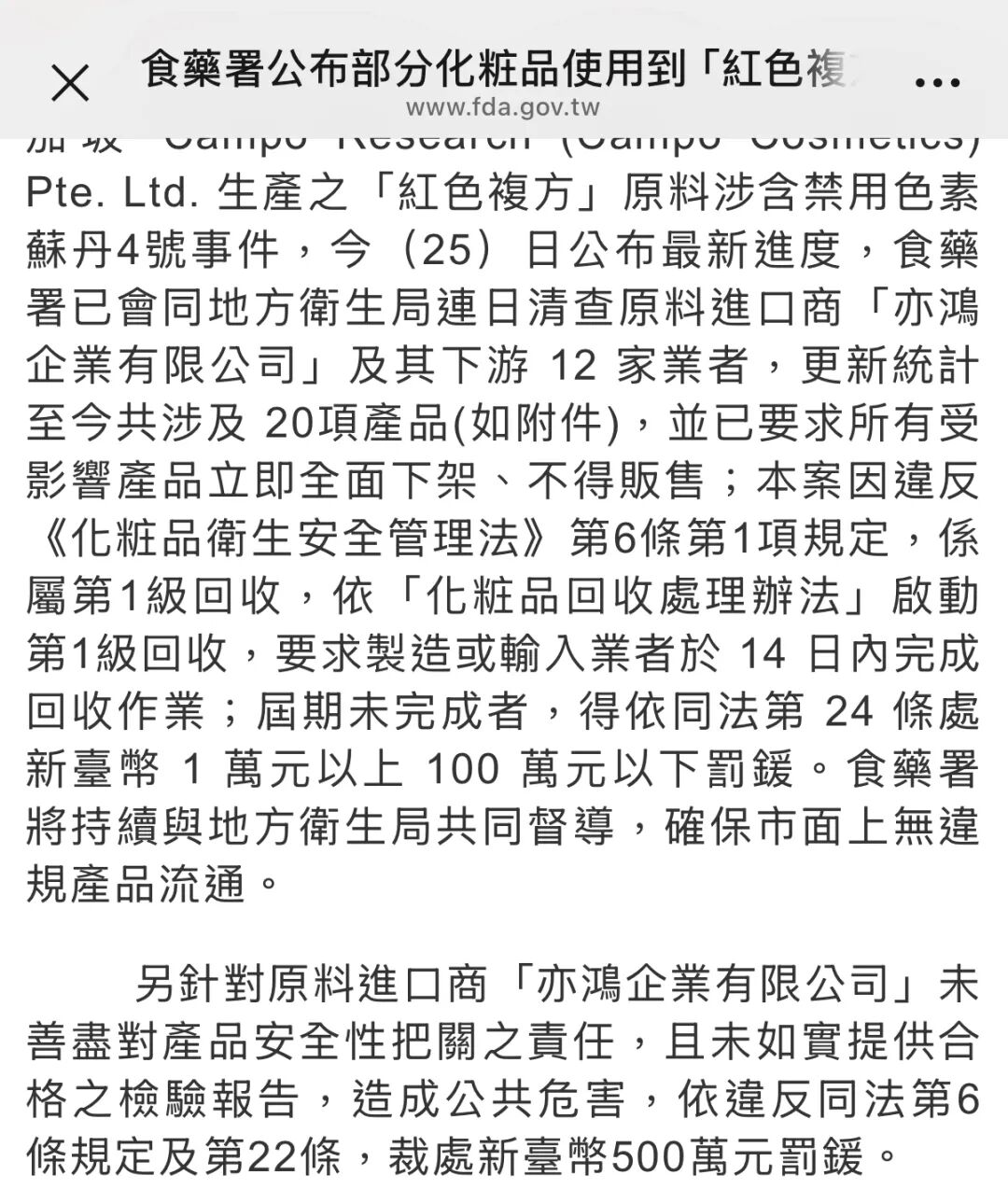 基于以上事实,在11月25日台湾食药署公布对问题原料进口商的处罚结果,认为亦鸿企业未落实产品安全把关责任、未如实提供合格检验报告,造成公共危害,以上行为违反《化妆品卫生安全管理法》,故裁处新台币500万元(约合人民币113万元)罚款。