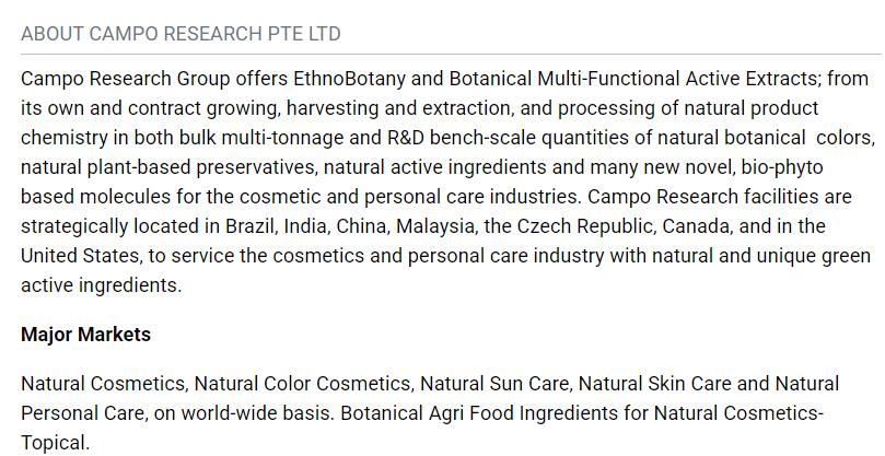 而据公开资料介绍,Campo Cosmetics初期核心业务为非西洋药材及草药批发,后来逐步聚焦美妆领域的天然原料业务。其产品主打天然植萃原料的研发、种植、提取及批量化供应,业务覆盖化妆品、个人护理等领域。