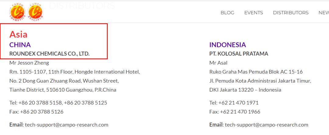 而在Campo Cosmetics公布的原料经销商名单中显示,其亚洲代理为ROUNDEX CHEM,这名称背后的主体为由程忆春经营的两家原料代理商——广州荣道化工有限公司(下文称“广州荣道”)与上海乾飞化工有限公司(下文称“上海乾飞”)。