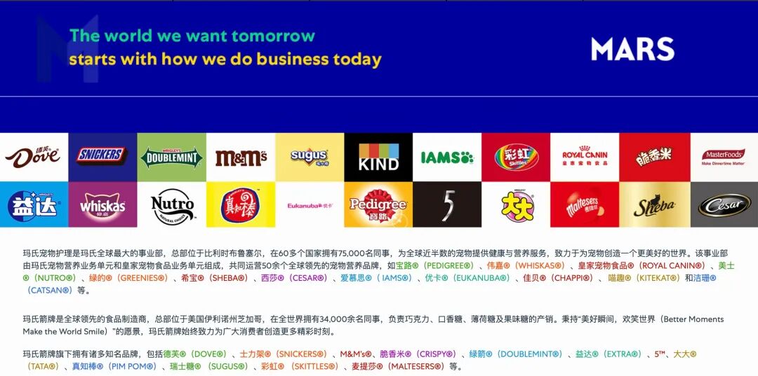 2020年后,玛氏加速并购步伐,先后收购能量棒品牌Kind北美业务、英国高端巧克力Hotel Chocolat、香港兽医诊所Creature Comforts等11家企业,覆盖健康零食、高端食品与宠物服务等多个赛道。
