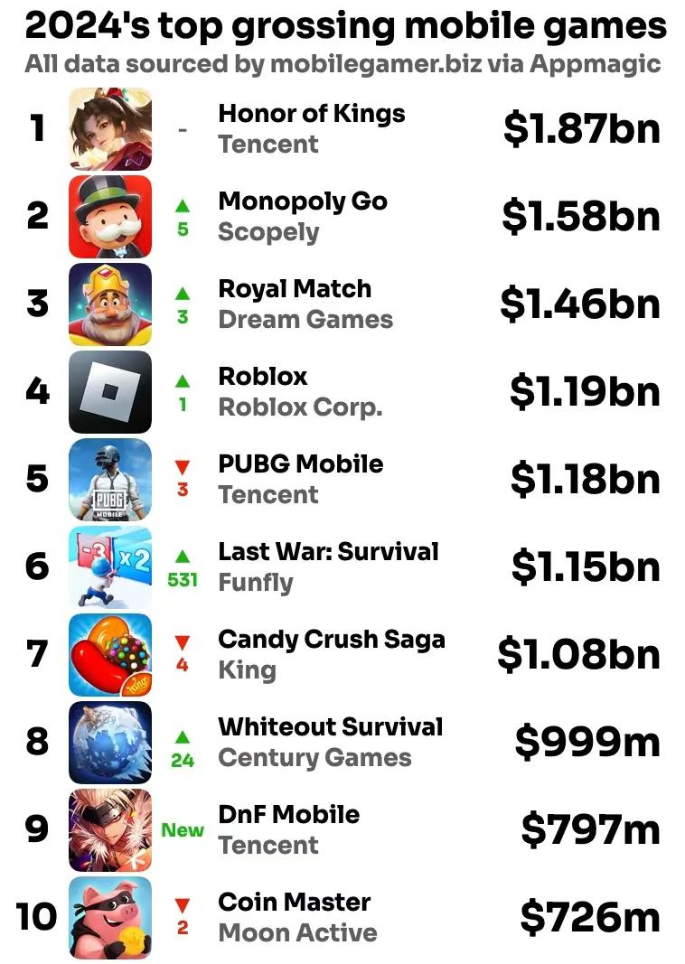 俗话说得好,物以稀为贵。过去的二十多年里,我们向来不缺赚钱的游戏。根据AppMagic公布的2024年全球手游收入榜显示,去年全球最赚钱的10款手游中,中国厂商占据4席,前20名中,中国厂商占据7席。