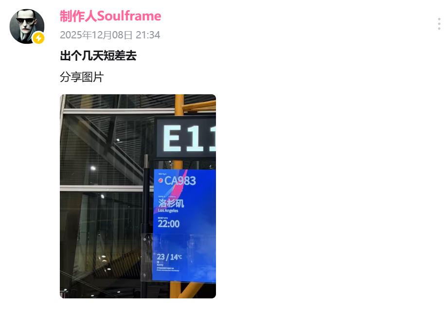 4天前,《影之刃零》制作人梁其伟在B站发布了一条图文动态:“出个几天短差去。”并配上了前往洛杉矶的航班照片。