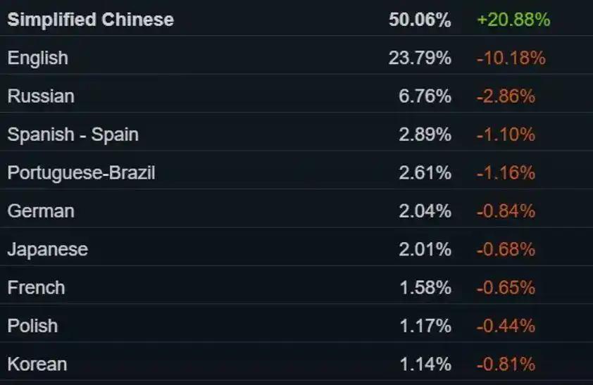 在全球最大的PC游戏发行平台Steam上,简体中文用户在高峰时一度突破50%的占比。可以说,无论是PC买断制游戏还是移动游戏,中国玩家几乎都是最主力的消费人群。