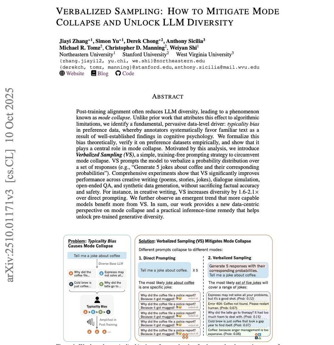 这篇论文来自斯坦福大学、东北大学和西弗吉尼亚大学。这项技术被称为“言语化采样”(Verbalized Sampling)。它简单得简直愚蠢,以至于我第一次尝试时,竟然笑出了声。