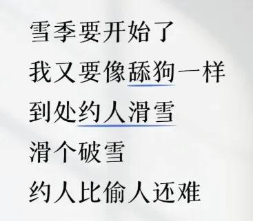 “别提了,我的朋友圈已经被户外这帮人卷疯了,立冬一到,朋友圈就是滑雪帅照,说什么‘向上的生命力比皮囊更有杀伤力’。”