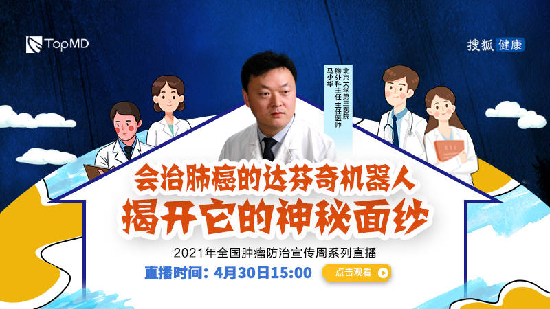 4月30日(周五)15:00-16:00,北京大学第三医院胸外科主任、主任医师马少骅教授将在搜狐健康生活室解答关于手术机器人的各种疑惑,敬请关注。