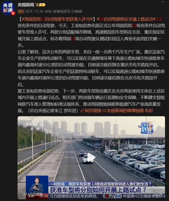 就在昨天,央视新闻在全平台发了一条看似平平无奇的消息,说是有两台新车已经获得了国内首批L3级别有条件自动驾驶的生产准入许可,将在北京、重庆指定区域开展上路的试点。