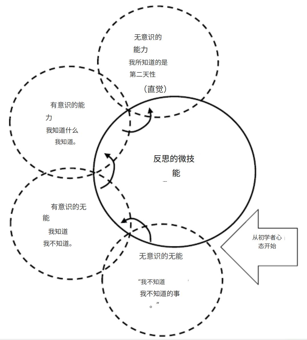 图4-2展示了我对威尔·泰勒(Will Taylor)学习模型的改编。模型的核心是反思的微技能 。请注意标有“从初学者心态开始”的箭头,这是我在第一文提出的建议。初学者在学习中遵循一个大致流程。他们开始时处于天真的状态,不知道自己不知道的事(即无意识的无能)。随着学习的进展,他们所知道的变成了第二天性(即无意识的有能)。
