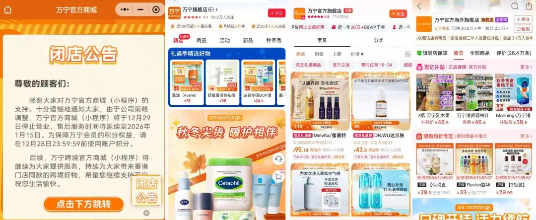 且需要注意的是,万宁在公告中还提及线上万宁官方商城、天猫、京东、拼多多旗舰店也将于本月26日24时停止销售,未来仅保留跨境官方商城、跨境电商继续为中国内地用户提供服务。