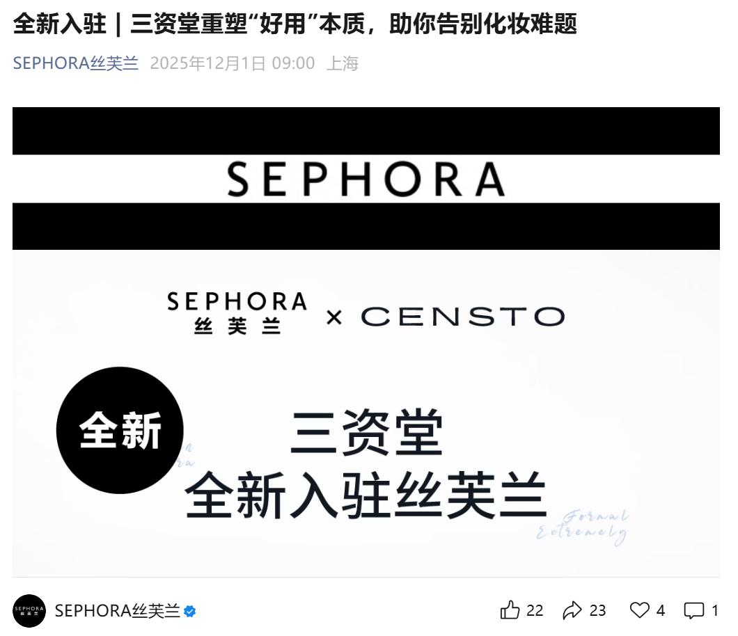 以丝芙兰为例,为应对中国市场业绩下滑,丝芙兰近年来通过全渠道转型、自降身份下沉市场、主动拥抱国货等展开自救。最近来看,本月初丝芙兰宣布引入彩妆品牌三资堂,以期强化与本土消费者的情感联结。